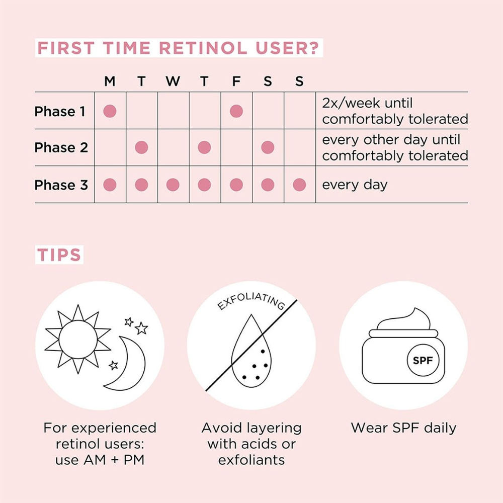 Formulated with pure retinol plus HPR, a next generation retinol, skin-firming peptides, moisture barrier-strengthening ceramides, plumping hyaluronic acid and skin-soothing botanicals. The light-as-air cream is gentle enough for day and nighttime usage and first time retinol users.