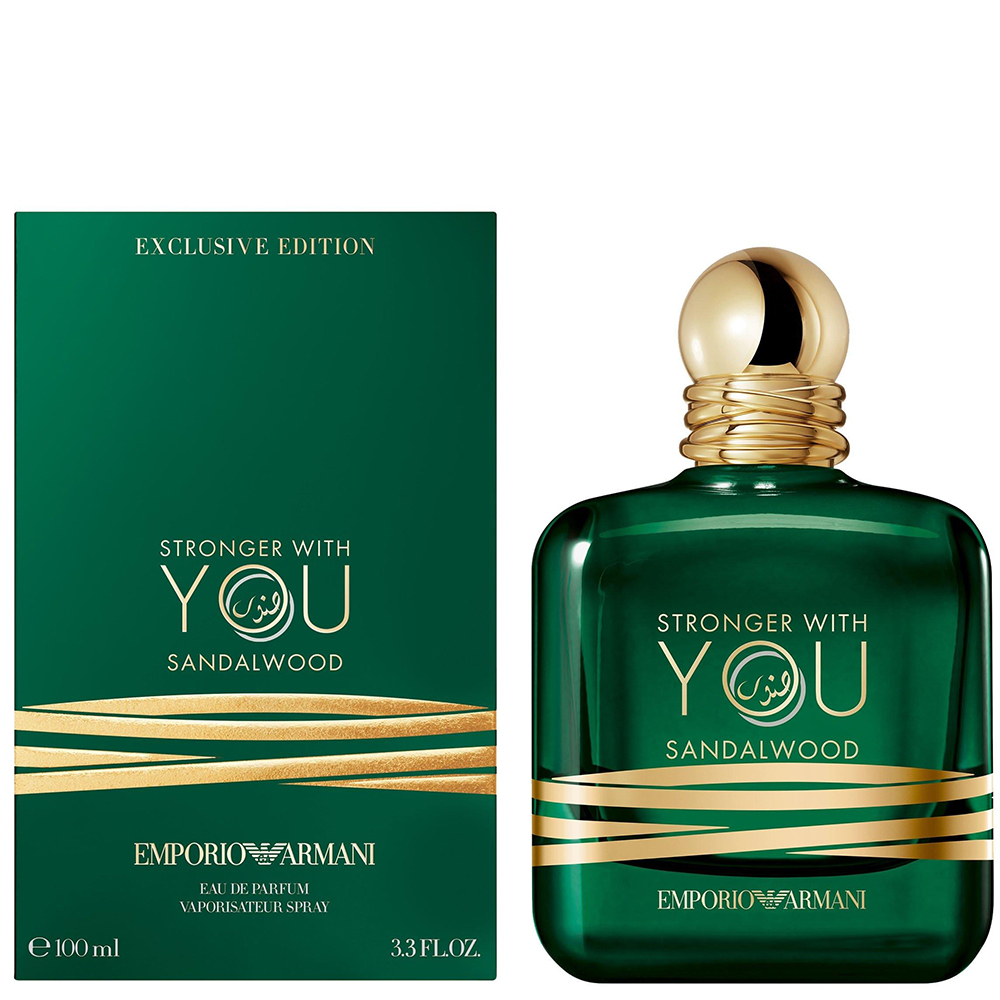 For Stronger With You Sandalwood, the iconic bottle takes on a mysterious new guise. A deep, gleaming green reflects the captivating and rich woody depths of the scent within. Two interlacing gold rings embrace the bottle. This motif is echoed in the tactile gold cap, intricately designed with the same entwined rings. Adding a striking final touch, the word “sandalwood” is elegantly inscribed in Arabic calligraphy, picked out in gold lettering within the “Stronger With You” name.